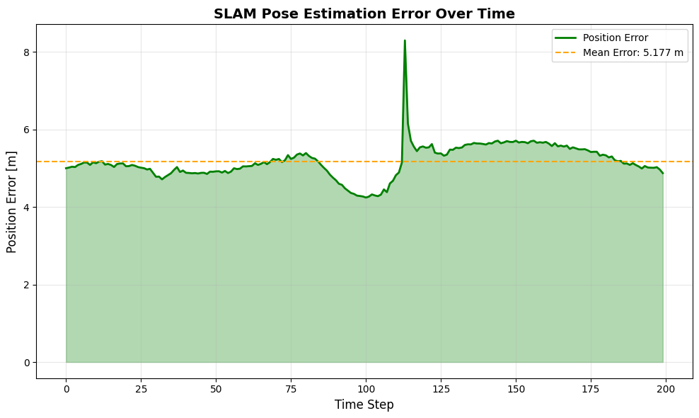 This final figure 7 tracks the absolute position error of the robot throughout the entire trajectory, plotting the Euclidean distance between estimated and true positions at each time step on a linear scale. The green line shows the error evolution, with the green fill area highlighting the magnitude of error, while the orange dashed line indicates the mean error across the entire simulation, providing a summary statistic for overall localization performance. The error profile typically shows gradual increase during pure motion segments followed by sharp reductions when landmark observations provide corrections, mirroring the uncertainty evolution pattern shown in Figure 3 but representing actual estimation error rather than theoretical uncertainty. The final error value and mean error statistic displayed in the legend provide quantitative metrics for evaluating overall SLAM performance, with successful implementations achieving mean errors well below the observation noise standard deviation. This visualization serves as the ultimate validation of the SLAM system, directly measuring how well the algorithm achieves its fundamental goal of accurate robot localization throughout the entire navigation task.