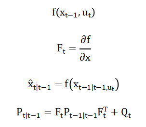 The prediction step linearizes the nonlinear motion model using the Jacobian to propagate the state and covariance forward through time where (Q_t) represents motion noise [32].
