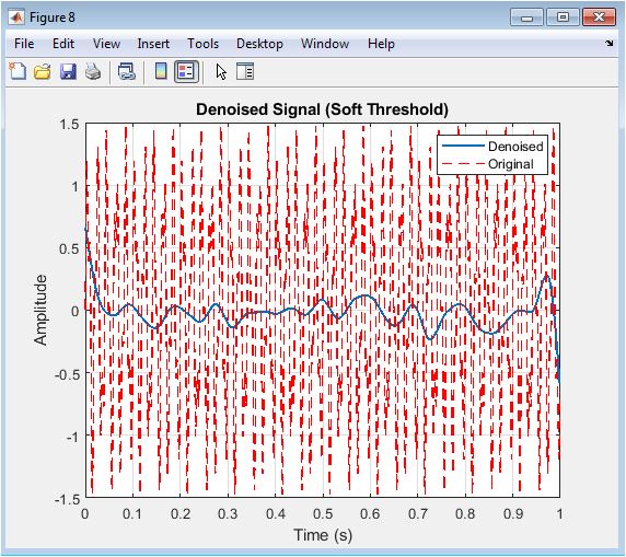 Figure 10 shows the denoised signal obtained using soft thresholding. The blue line represents the denoised signal, and the red dashed line indicates the original signal. Soft thresholding produces a smoother output by gradually shrinking coefficients instead of setting them to zero. Noise is effectively reduced while signal peaks are preserved with minimal distortion. This figure illustrates the advantage of soft thresholding in maintaining amplitude continuity. Comparing with Figure 7, soft thresholding results in fewer abrupt changes or artifacts. The reconstructed waveform closely resembles the original signal in both shape and amplitude. Visual inspection confirms the efficacy of wavelet shrinkage. This approach is suitable for applications requiring smooth signal recovery. It demonstrates the robustness of wavelet-based denoising techniques.