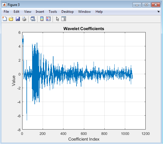 Figure 7 shows the wavelet coefficients after hard thresholding is applied. In hard thresholding, coefficients below the threshold are set to zero, effectively removing noise components. Large coefficients representing significant signal features are retained. This results in a sparse coefficient set, preserving sharp signal transitions. The plot demonstrates how noise is eliminated while major signal structures remain intact. Some abrupt changes may occur due to the binary nature of hard thresholding. The figure highlights the trade-off between noise suppression and potential artifacts. Visual comparison with Figure 3 reveals which coefficients were removed. Hard thresholding is effective in signals with prominent peaks but may introduce slight discontinuities.