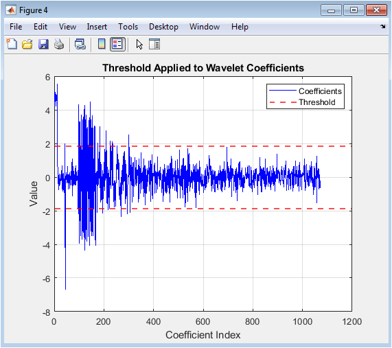 Figure 6 overlays the universal threshold on the wavelet coefficients. The red dashed lines represent positive and negative threshold values, defining which coefficients will be modified. Coefficients below the threshold are likely dominated by noise and are candidates for suppression. Coefficients above the threshold mostly contain meaningful signal information. This visualization demonstrates the selection process for both hard and soft thresholding. It clarifies the rationale behind wavelet shrinkage methods. Observing the threshold relative to the coefficients helps understand the balance between noise removal and signal preservation. The figure emphasizes the effectiveness of wavelet-based denoising over simple filtering. It also illustrates why inappropriate thresholding can either leave noise or remove important signal features.