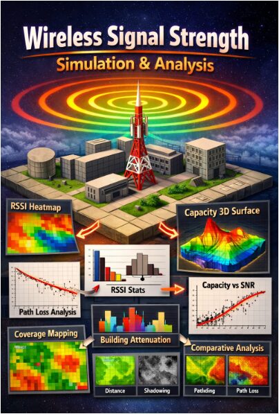 The performance of these systems is highly dependent on how radio signals propagate through the environment, where factors such as distance, buildings, obstacles, and terrain significantly affect signal quality. Accurate modeling and visualization of wireless signal strength are therefore critical for efficient network planning and performance optimization. Traditional analytical models often fail to capture the combined impact of complex propagation phenomena in realistic environments. As a result, simulation-based approaches have gained increasing importance in wireless research and engineering practice [6]. This work focuses on developing a comprehensive wireless signal strength mapping framework that integrates multiple propagation mechanisms into a single model. The proposed approach incorporates path loss, shadow fading, building attenuation, and multipath effects to emulate real-world signal behavior [7]. A two-dimensional spatial grid is used to evaluate Received Signal Strength Indicator, Signal-to-Noise Ratio, and channel capacity across the coverage area. Advanced visualization techniques are employed to clearly illustrate spatial variations in signal performance [8]. In addition, coverage analysis is performed to identify weak-signal regions and coverage holes. The objective of this study is to provide an intuitive yet technically rigorous tool for understanding wireless signal behavior in complex environments. Such a framework is valuable for network designers, researchers, and students seeking to analyze and optimize wireless communication systems [9].