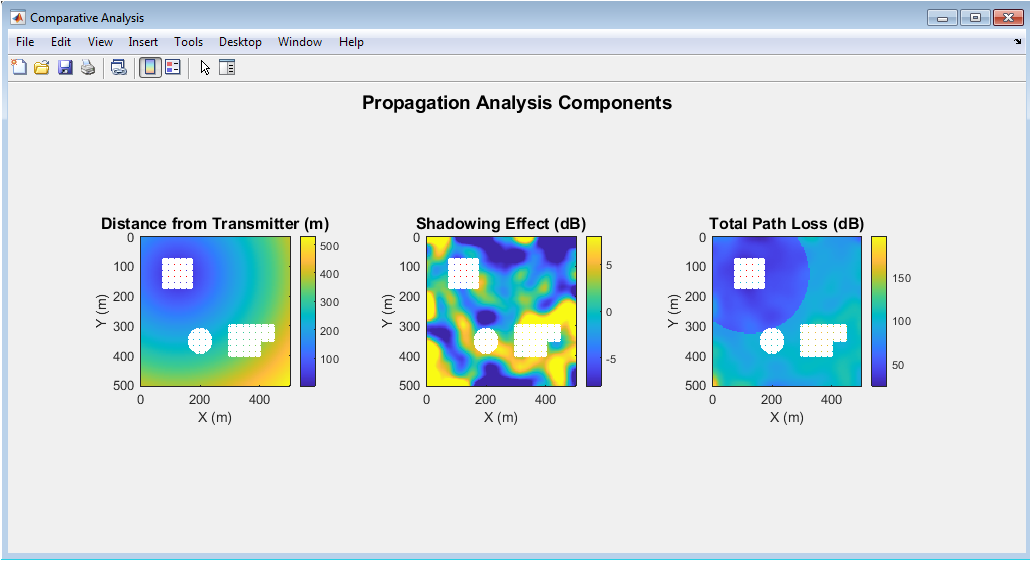 This figure combines distance, shadowing, and path loss into a single comparative visualization. Subplots separately show each effect for clarity. Distance highlights geometric attenuation from the transmitter. Shadowing subplot shows environmental variability due to obstacles. Path loss subplot combines structural and distance effects. It allows easy comparison of different propagation factors. Walls and floors appear as critical regions reducing signal strength. The figure supports holistic network analysis and planning. It identifies key factors affecting wireless performance. Engineers can use it to optimize coverage and capacity. Overall, it consolidates multiple propagation aspects for deeper insight.