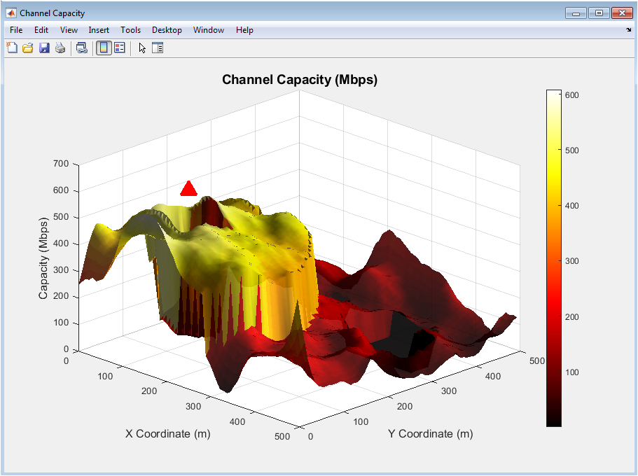 This three-dimensional surface plot depicts the achievable channel capacity in Mbps. Peaks correspond to high-capacity areas near the transmitter. Lower areas represent zones with reduced capacity due to distance and obstructions. Multipath fading and shadowing influence the surface topology. The 3D view allows understanding how capacity varies in both X and Y directions. It highlights coverage limitations caused by walls and floors. Transmitter placement directly impacts maximum capacity zones. This plot helps in visualizing data throughput potential in real-world deployments. High-capacity zones suggest optimal locations for high-demand users. Overall, it combines distance, attenuation, and fading effects in one visualization.