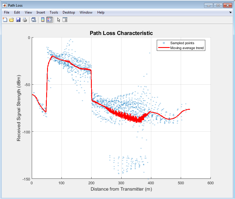 This figure presents a scatter plot of RSSI versus distance from the transmitter. The trend shows a decrease in received signal strength with increasing distance. Moving average lines smooth the variations caused by shadowing and multipath. Walls and floors cause sudden drops in path loss at specific locations. The plot confirms the behavior predicted by free-space, two-ray, and log-distance models. High-density points indicate sampled locations in the environment. The visualization helps verify the accuracy of the path loss model. Outliers reveal areas heavily affected by obstacles. It demonstrates how environmental factors influence signal decay. This figure is essential for link budget calculations and network planning.