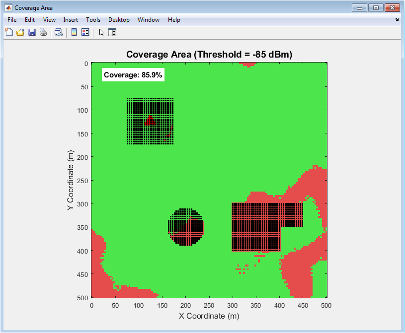 This figure highlights areas where the RSSI exceeds a predefined threshold. Green regions indicate good coverage, while red zones represent coverage holes. The transmitter is marked for reference. Walls and floors create shadows and gaps in the coverage area. The map provides a visual tool for identifying network blind spots. It calculates the total area covered as a percentage of the environment. The size and location of coverage holes are also determined. This information is crucial for improving deployment efficiency. It allows network engineers to plan additional access points. Overall, it summarizes wireless coverage effectiveness.