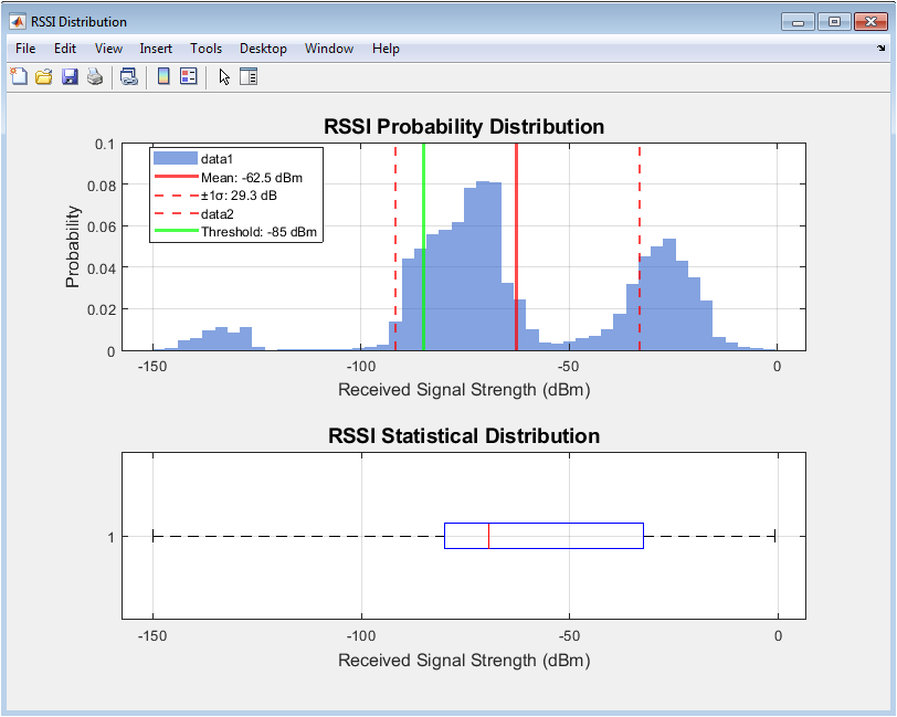 This figure displays the statistical distribution of RSSI values across the environment. The histogram shows the probability of receiving signals at different strength levels. Mean and standard deviation lines provide key statistical metrics. Coverage threshold is marked to identify areas below acceptable signal levels. The boxplot shows the spread and outliers of RSSI data. Strong signals are concentrated near the transmitter, while weaker signals occur farther away. It helps to assess network reliability and consistency. Statistical visualization complements spatial heatmaps. It identifies areas needing signal enhancement. Overall, it provides insight into overall signal performance.