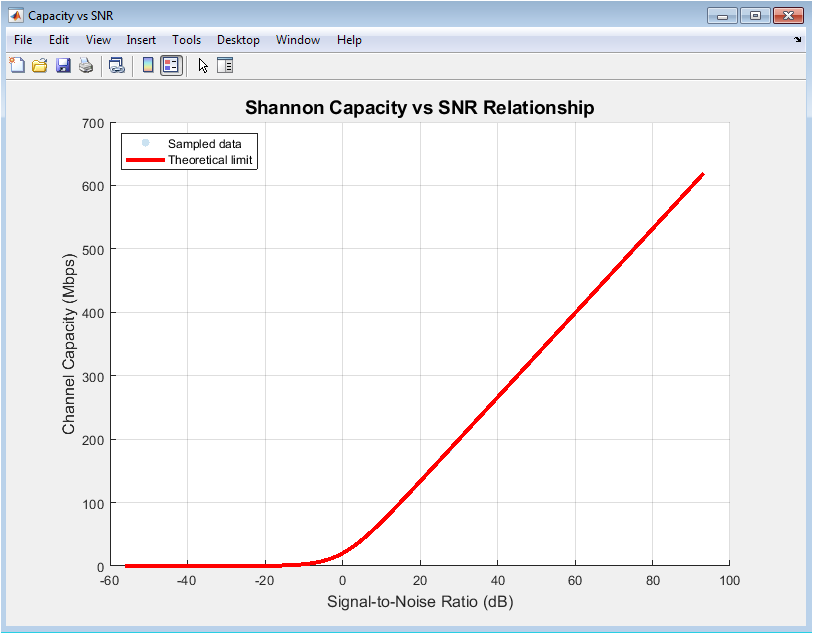 This figure illustrates the relationship between SNR and achievable channel capacity. Sampled points show actual capacity in the environment. The Shannon capacity curve indicates the theoretical maximum limit. Points below the curve represent practical limitations caused by fading and shadowing. The plot helps understand efficiency and performance of the network. High SNR corresponds to higher capacity, validating expected behavior. Outliers highlight areas affected by obstacles or multipath effects. This visualization supports network optimization and planning. It demonstrates the fundamental trade-off between signal quality and throughput. Overall, it connects physical layer measurements with performance metrics.