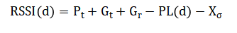 Where (P_t) is transmit power, (G_t) and (G_r) are antenna gains, (PL(d)) is the distance-dependent path loss, and (X_sigma) represents log-normal shadow fading. The log-distance path loss is given by: