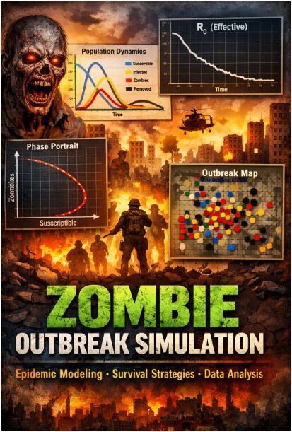 The mathematical framework of the zombie outbreak model is based on a stochastic agent-based extension of compartmental epidemiological dynamics. The population is divided into four discrete states susceptible (S), infected (I), zombie (Z), and removed (R) with probabilistic state transitions governed by infection rate, conversion delay, natural mortality, vaccination, and suppression parameters. Spatial interactions are modeled in a bounded two-dimensional domain where infection occurs when the Euclidean distance between agents falls below a defined transmission radius. The effective reproduction number is estimated dynamically as a function of transmission probability and the proportion of susceptible individuals. System evolution is computed using discrete-time updates, enabling nonlinear and emergent outbreak behavior to arise from localized interactions. The mathematical formulation is built on a stochastic spatial S–I–Z–R framework where state transitions are governed by probabilistic rules. The infection process is defined as is transmission probability, ( r ) is infection radius, and (d_{SZ}) is Euclidean distance between susceptible and zombie agents.