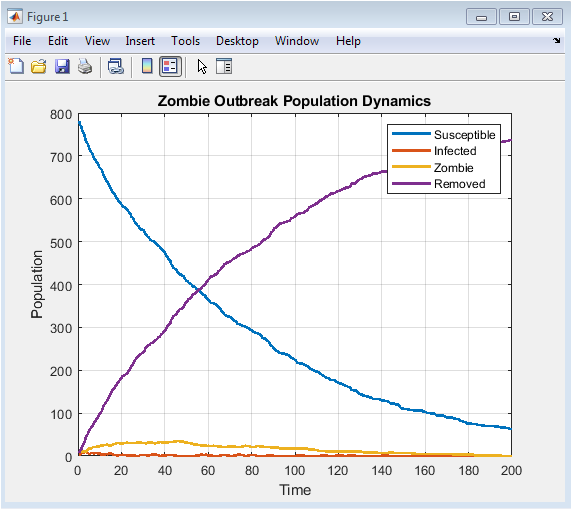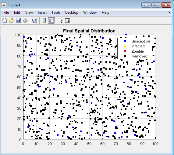 This study contributes a comprehensive computational framework for simulating zombie outbreak dynamics. By integrating spatial movement, stochastic transmission, delayed conversion, and intervention strategies, the model captures complex epidemic behavior. The agent-based structure allows emergent phenomena to arise naturally from individual interactions. MATLAB implementation enables efficient numerical computation and visualization. Although inspired by a fictional scenario, the methodology reflects authentic epidemiological principles. The model serves as both an educational and research-oriented tool. It facilitates exploration of epidemic thresholds, control mechanisms, and nonlinear population dynamics [20]. Furthermore, the engaging zombie context enhances accessibility without compromising scientific rigor. This interdisciplinary approach bridges mathematical modeling, computational simulation, and public health strategy. Ultimately, the study demonstrates how creative analogies can advance understanding of complex epidemic systems.