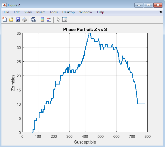 This phase portrait displays the nonlinear interaction between susceptible and zombie populations. The trajectory shows how a decline in susceptibles corresponds to an increase in zombies. Early in the outbreak, susceptibles remain high while zombies are few, creating the initial growth curve. As infection spreads, the system follows a steep trajectory, indicating rapid outbreak escalation. Intervention and removal processes gradually slow zombie growth. The curve eventually loops or stabilizes, representing outbreak containment or equilibrium. Phase portraits highlight threshold effects, where small changes in susceptible numbers significantly affect zombie prevalence. The figure also reveals emergent dynamics not visible in time-series plots. It is useful for identifying critical population levels that control outbreak intensity. Overall, it emphasizes the interdependence of susceptible and zombie compartments.