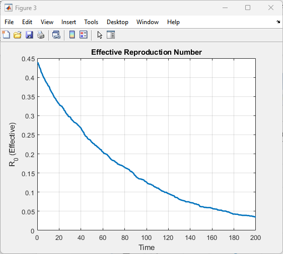 The effective reproduction number serves as a key metric in epidemic analysis. It estimates the expected number of secondary infections generated by one infectious individual. In this simulation, a time-varying reproduction indicator is calculated based on susceptible population levels. When this value exceeds unity, outbreak growth becomes likely. Conversely, values below one indicate epidemic decline. Monitoring this metric provides insight into stability conditions. It connects the computational simulation to established epidemiological theory [15]. Changes in reproduction dynamics reflect intervention impacts and population depletion. Thus, the reproduction number acts as a bridge between micro-level simulation and macro-level interpretation. Its temporal evolution highlights critical turning points. This metric is essential for understanding outbreak sustainability.