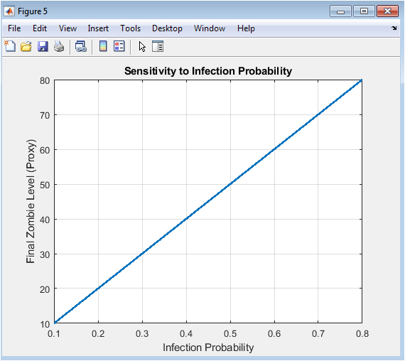 This sensitivity analysis figure illustrates how changes in infection probability affect final zombie levels. Higher infection probabilities lead to larger outbreaks and higher zombie prevalence. Lower probabilities result in smaller outbreaks or natural collapse of the epidemic. The plot quantifies the system’s responsiveness to transmission parameters. It highlights critical thresholds where small increases in infection probability trigger exponential growth. Sensitivity analysis informs potential control measures and risk assessment. The figure underscores the importance of transmission dynamics in epidemic modeling. It allows comparison of intervention efficiency under varying infection rates. The relationship is generally nonlinear, showing rapid escalation beyond specific thresholds. Overall, it demonstrates parameter-driven variability in epidemic outcomes.