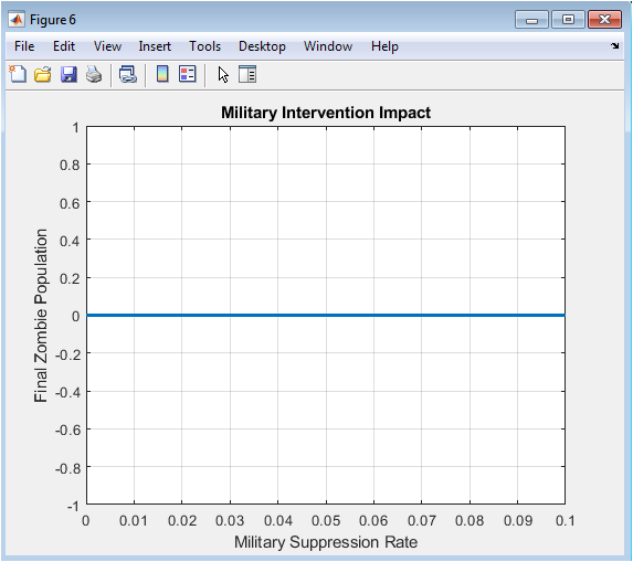 This figure evaluates the effect of different military suppression rates on the final zombie population. Higher suppression rates correspond to a lower number of surviving zombies. Low or zero suppression results in uncontrolled zombie growth and peak prevalence. The figure demonstrates how intervention intensity can alter outbreak trajectories. It highlights the effectiveness of proactive containment strategies. Exponential decline trends indicate diminishing returns at very high suppression rates. The plot provides quantitative guidance for resource allocation in outbreak management. It complements sensitivity analysis by showing the impact of control measures rather than transmission parameters. The figure emphasizes that timely and sufficient intervention is critical. Overall, it visually represents the link between intervention policy and epidemic control.