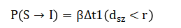 The first equation describes the probability that a susceptible individual becomes infected during a small time interval, which depends on the transmission rate, the length of the time step, and whether the individual is physically close to a zombie within a defined infection radius. This means infection can only occur through local contact, emphasizing spatial interaction rather than global mixing. The second relationship explains how infected individuals decrease over time as they convert into zombies after a fixed delay period, representing an incubation-like stage before full transformation. The conversion rate is determined by the inverse of the specified transformation time, meaning shorter delays produce faster zombie growth. The third equation models the increase in the removed population, which includes individuals who die naturally, are vaccinated, or are eliminated through military suppression. Each removal pathway is governed by its own rate parameter, allowing independent control of intervention intensity. These removal mechanisms reduce the number of active participants in the outbreak system. The reproduction number expression links transmission strength to the proportion of remaining susceptible individuals in the population. As susceptibles decrease, the effective reproduction potential also declines. Together, these relationships describe how local infection, delayed conversion, and intervention strategies collectively drive the nonlinear dynamics of the outbreak.
